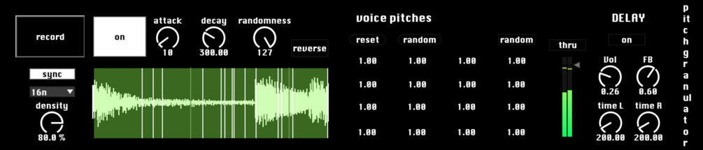 Pitch Granulator is a granular audio effect. It allows you to record audio and play it back with 16 grains. The pitch of each grain can be set separately and be played in reverse.