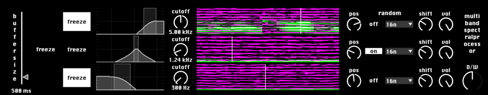 The audio input is divided into 3 bands with a different filter on each of them (the sound passes trough the filter before spectral analysis). Each band can be freezed independently and be pitched up or down.